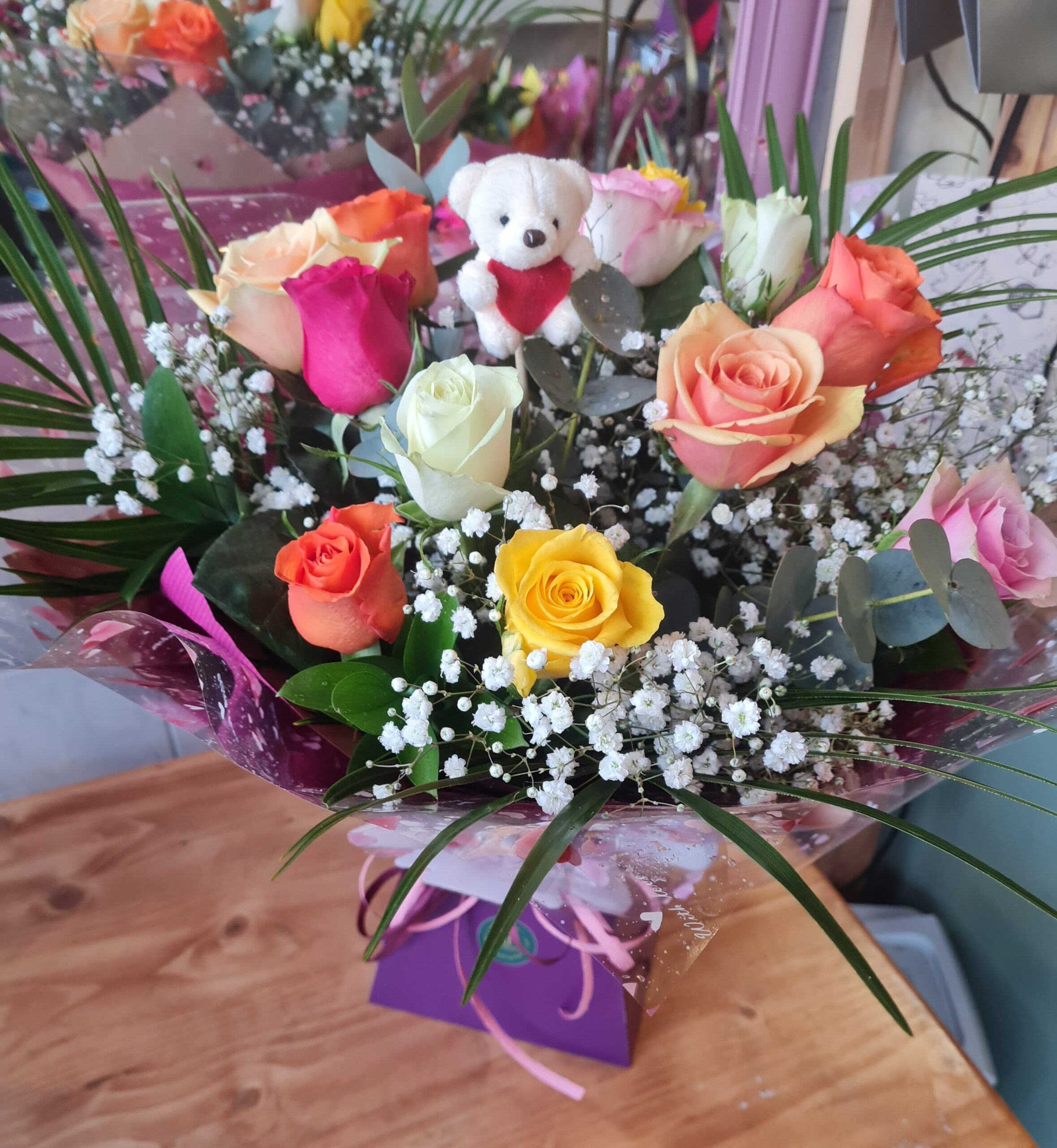 Pretty mixed colours roses handtied and displayed beautifully in a lovely water box presentation