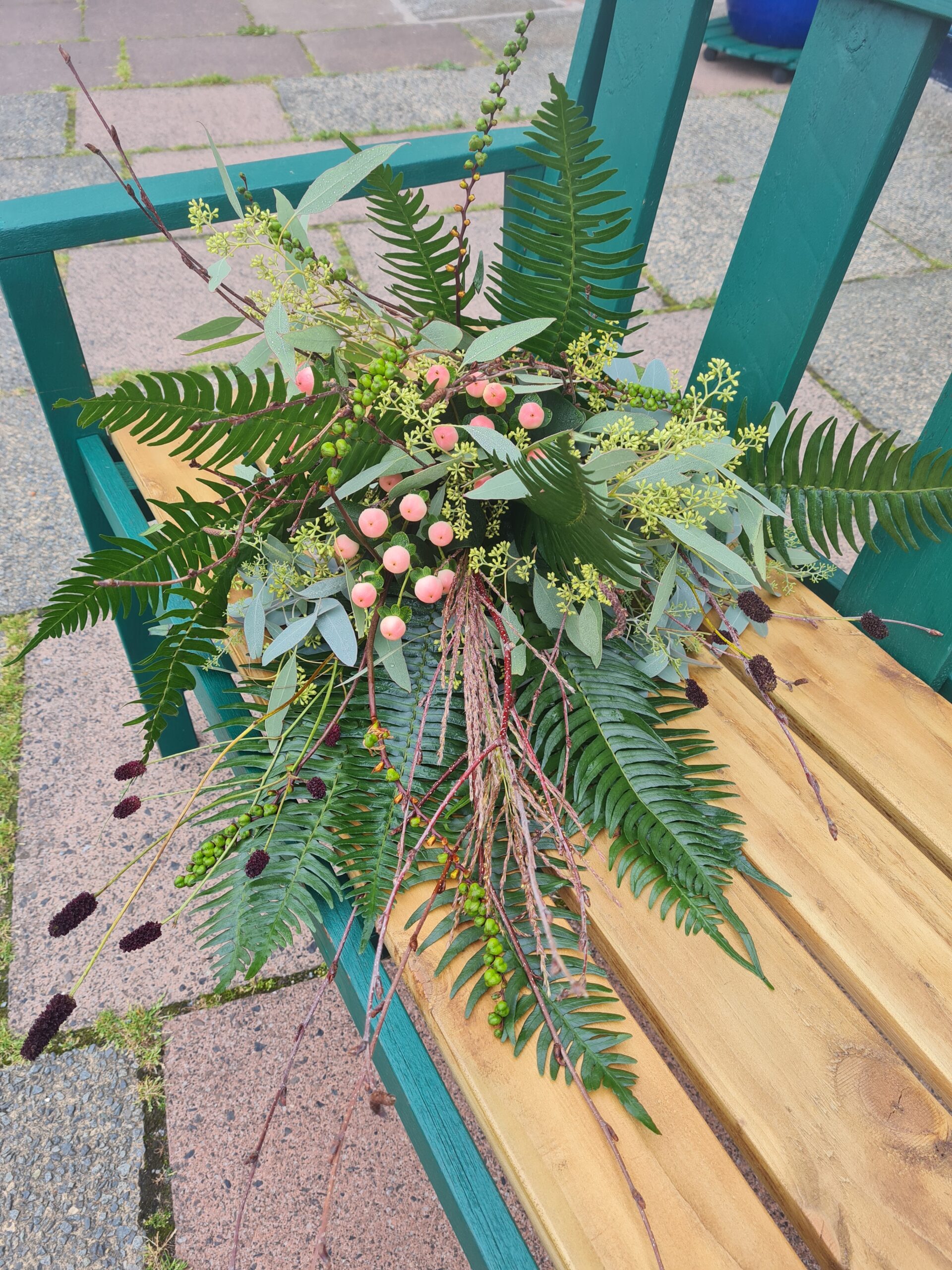 A woodland themed cascading wedding bouquet evokes natural, organic feel, typically featuring a mix of greenery, and rustic toned flowers arranged in a waterfall shape to create a sense of movement and connection to nature